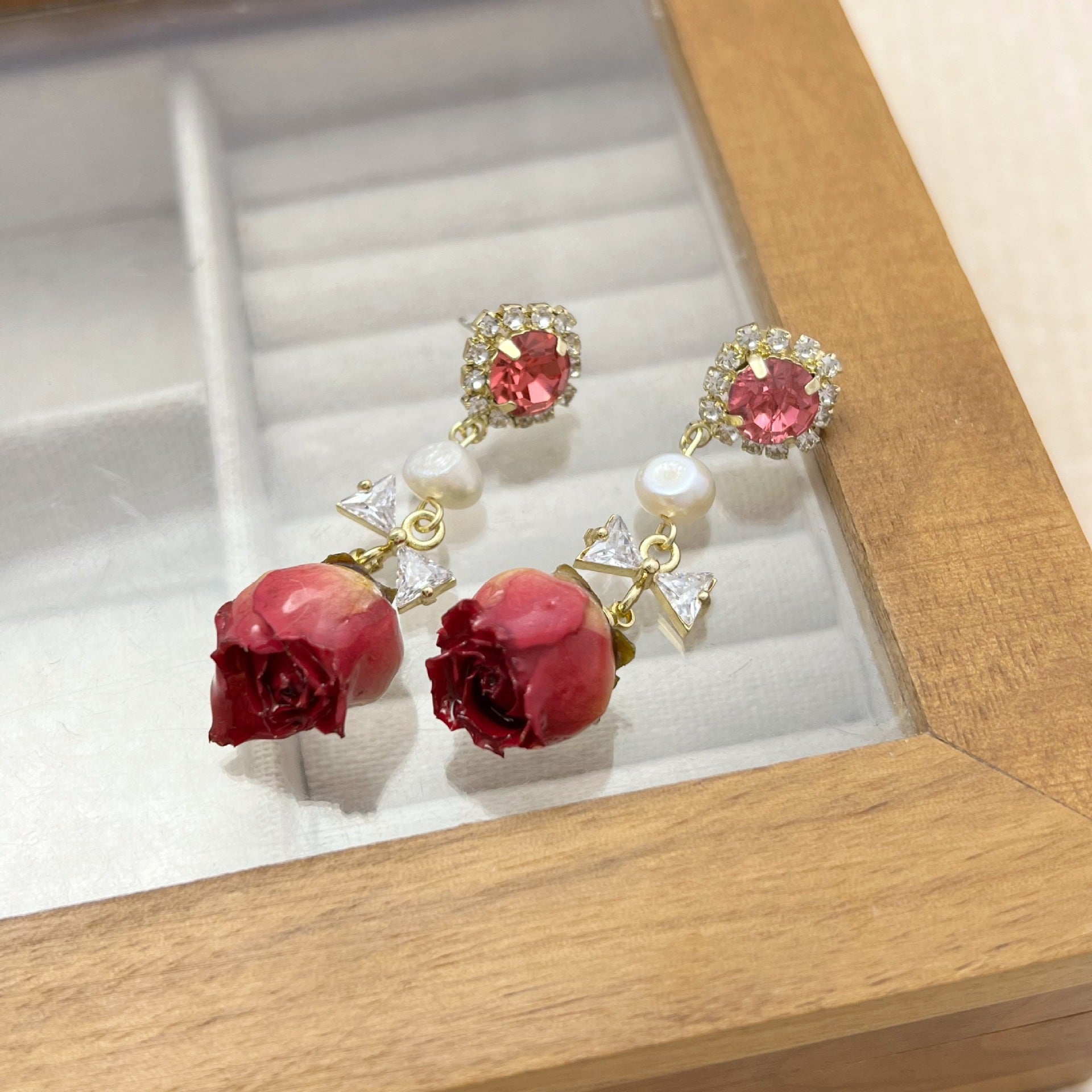 Preserved Flower Earrings - Niche Vintage Forest-Style Freshwater Pearl Rose Earrings (TE35)